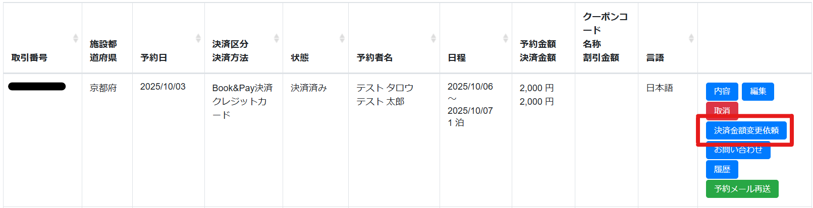 対象の取引がヒットしたら、右側の[決済金額変更依頼]ボタンを押下します。