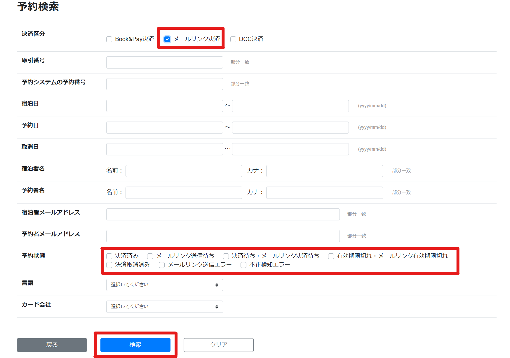 [決済区分]では[メールリンク決済]に✓を入れ、[予約状態]では全ての✓を外してください。