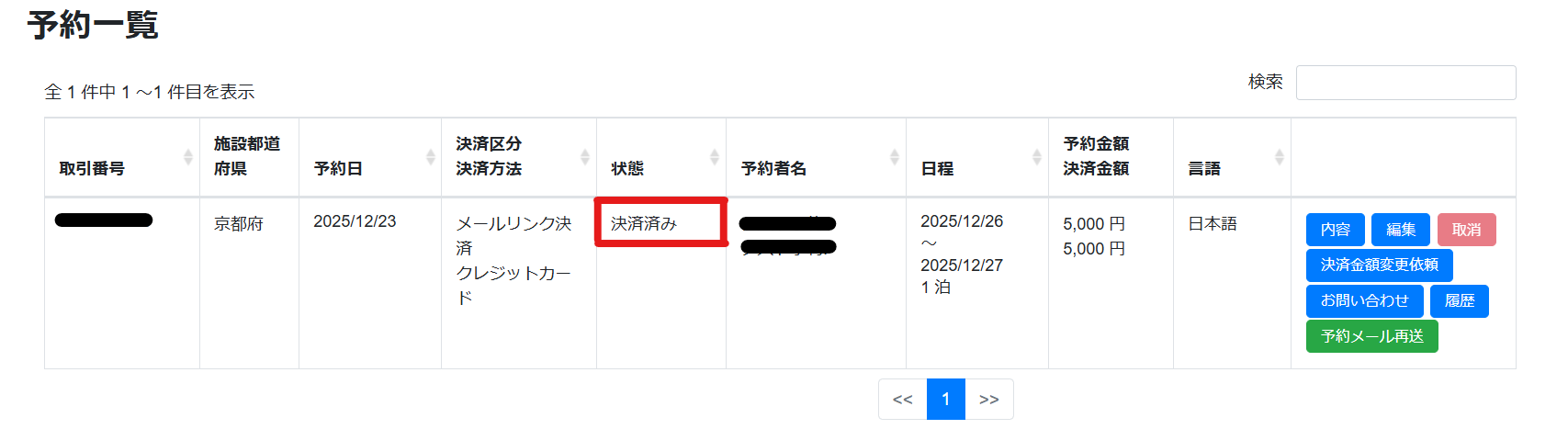⑵管理画面メニュー[予約検索]より該当のメールリンク決済取引を検索