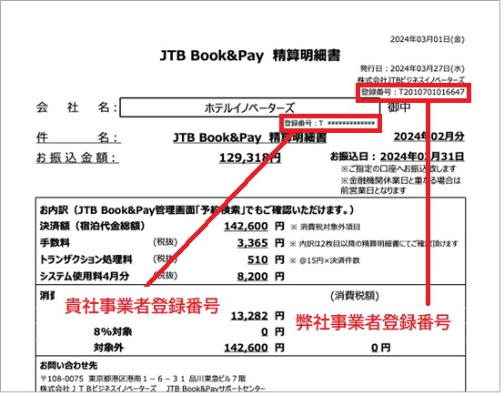 JTB Book&Pay精算明細書面に貴社事業者登録番号と弊社事業者登録番号が記載されます。