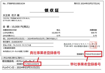 領収証発行面に貴社事業者登録番号とJTBビジネスイノベーターズ事業者登録番号が記載されます。