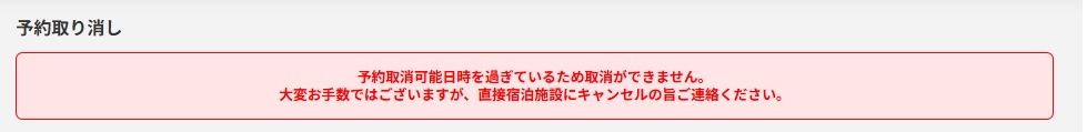 お客様ご自身での取り消し可能日時が過ぎている場合や、クレジットカード処理エラーにより、予約管理画面から予約の取り消しができない場合がございます。お手数ですが、ご予約の宿泊施設へお問い合わせいただき予約を取り消したい旨お申し出ください。