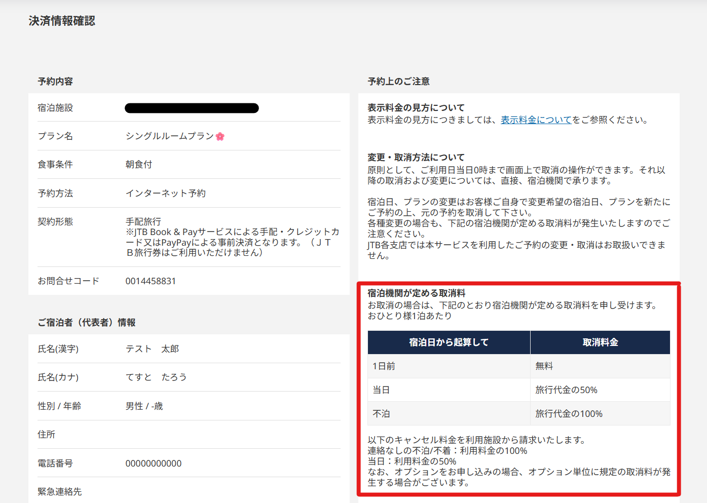 ご予約のプランの取消料規定は、予約管理画面[決済情報確認]メニュー内の