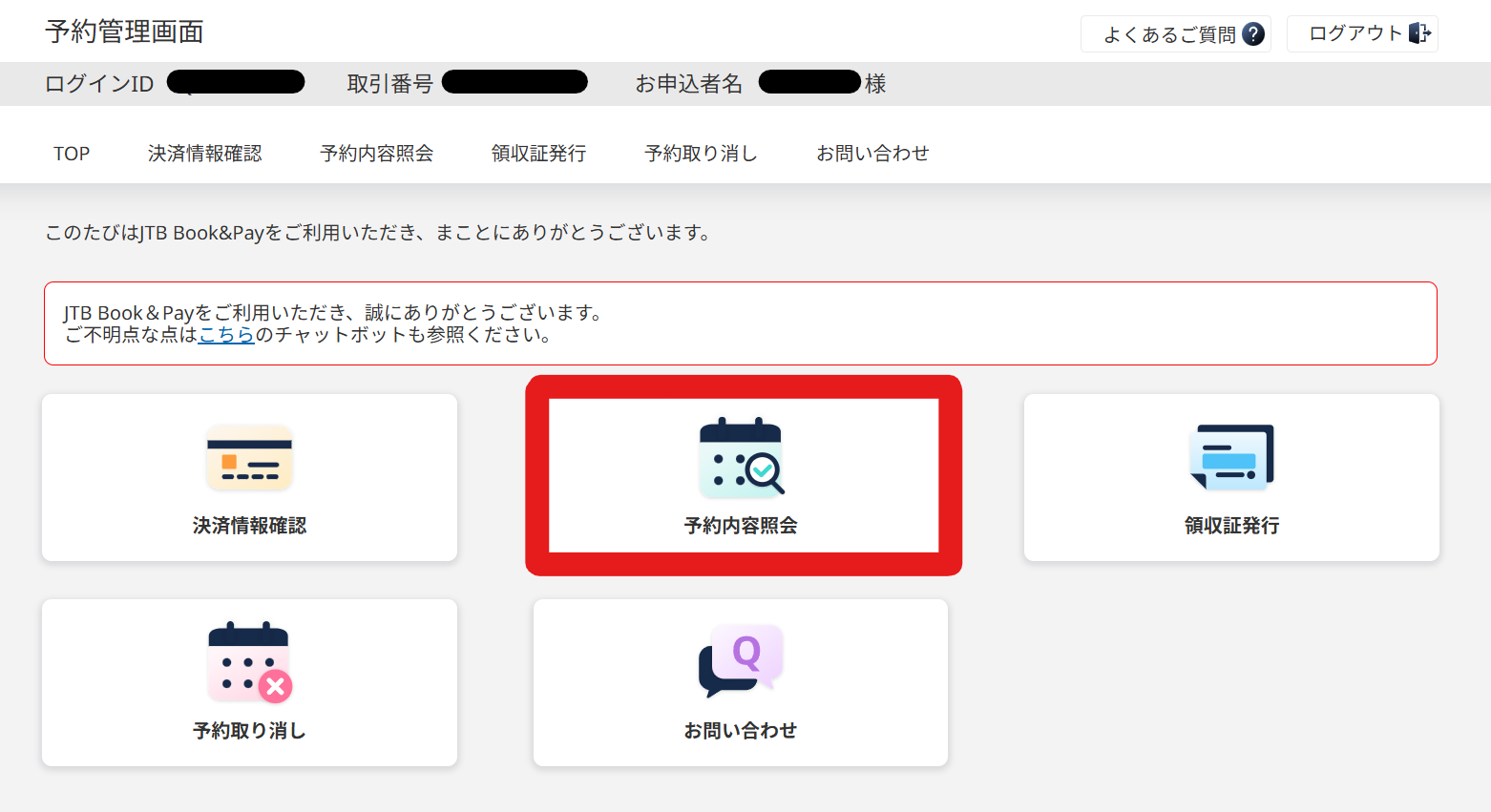[予約内容照会]メニューでご確認いただける内容は以下の通りです。