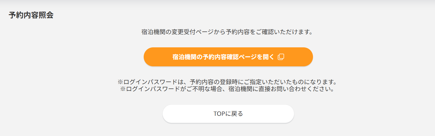[宿泊機関の予約内容確認ページを開く]を押下すると、宿泊施設の予約内容確認ページのログイン画面が表示されます。
