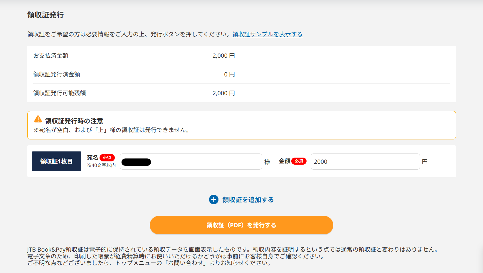 領収証の発行画面が表示されます。
