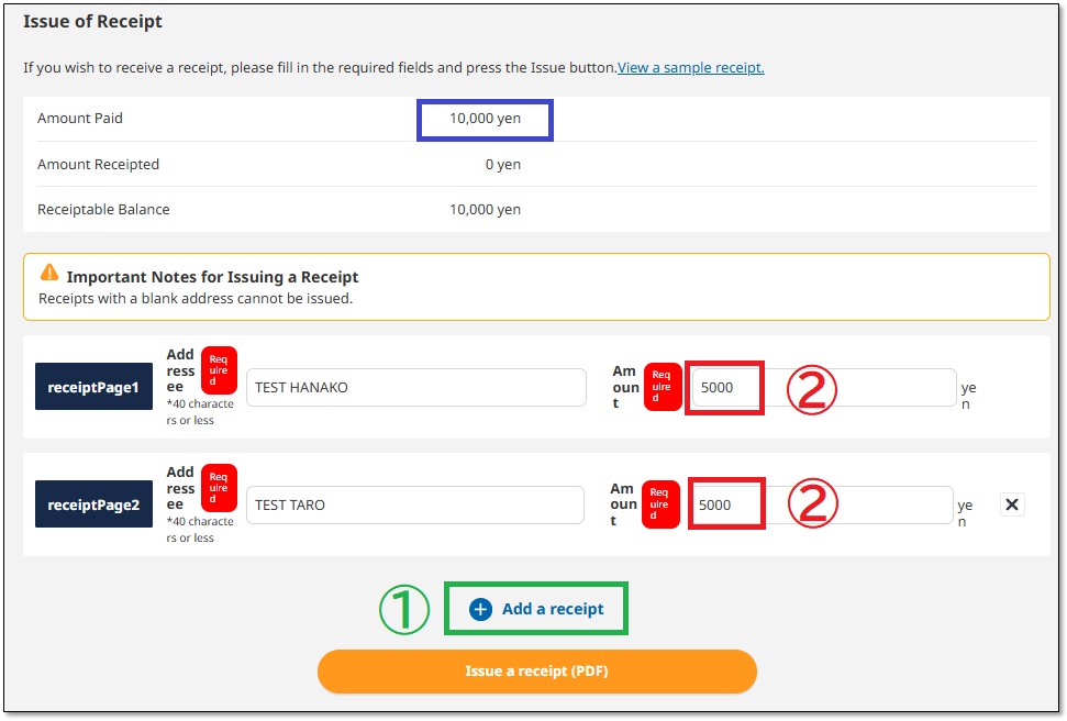 If you want to issue PDFs individually, do not click "+Add receipt",