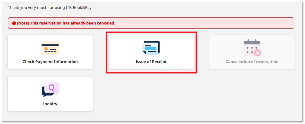 Log in to 「Reservation Management Screen」 and click "Issue of Receipt".