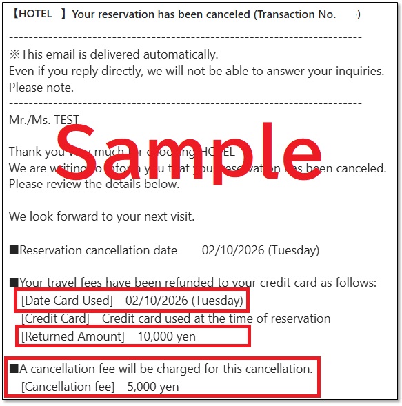 Once your reservation cancellation is complete, you will receive a confirmation email titled "【HOTEL】Your reservation has been canceled (Transaction No. )".