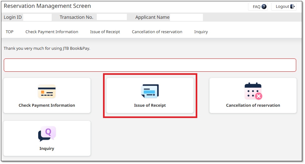 (1) Log in to 「Reservation Management Screen」 and click "Issue of Receipt".