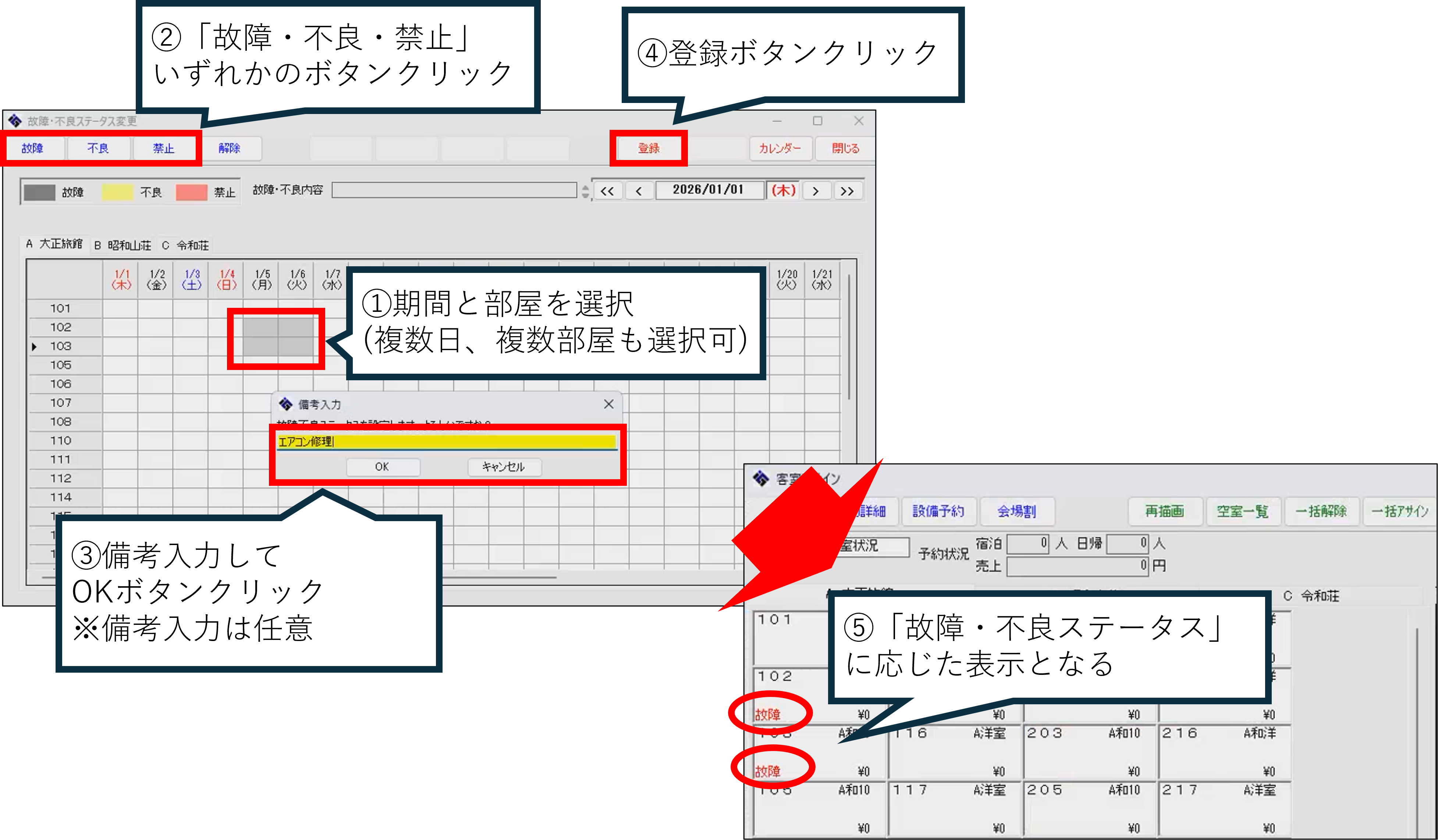 ※「不良」設定時は、該当部屋に対して予約登録可能