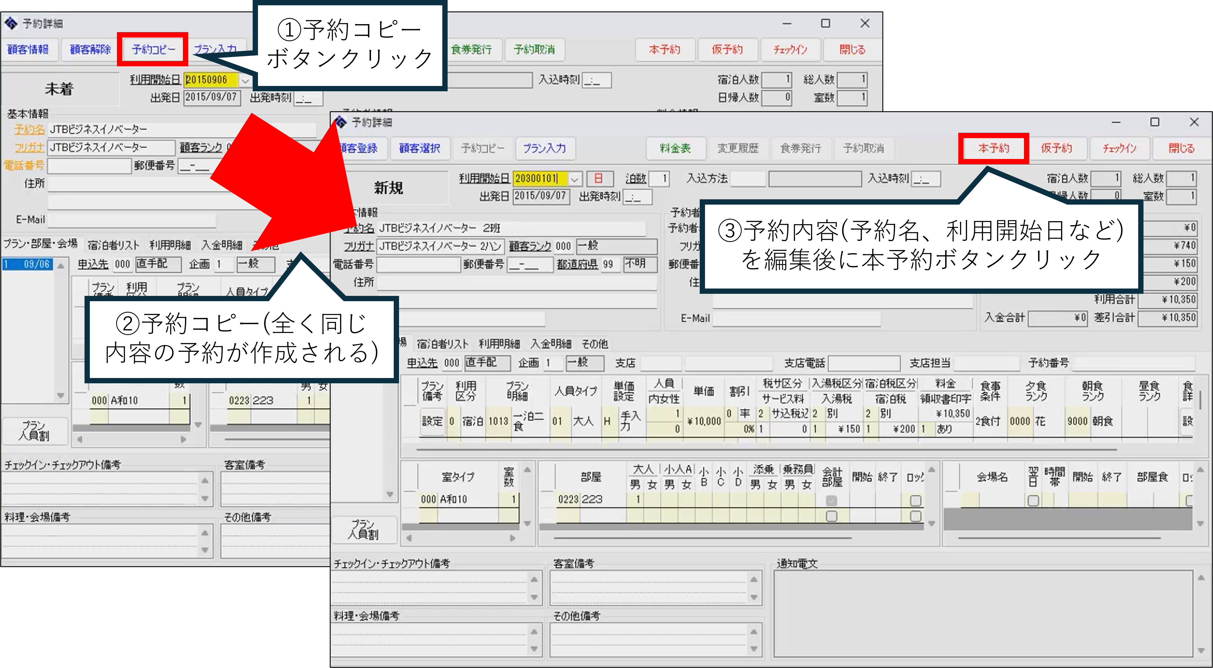 適切な情報(利用日、予約名、プラン情報、等)に内容変更後、「本予約」ボタンをクリックします。