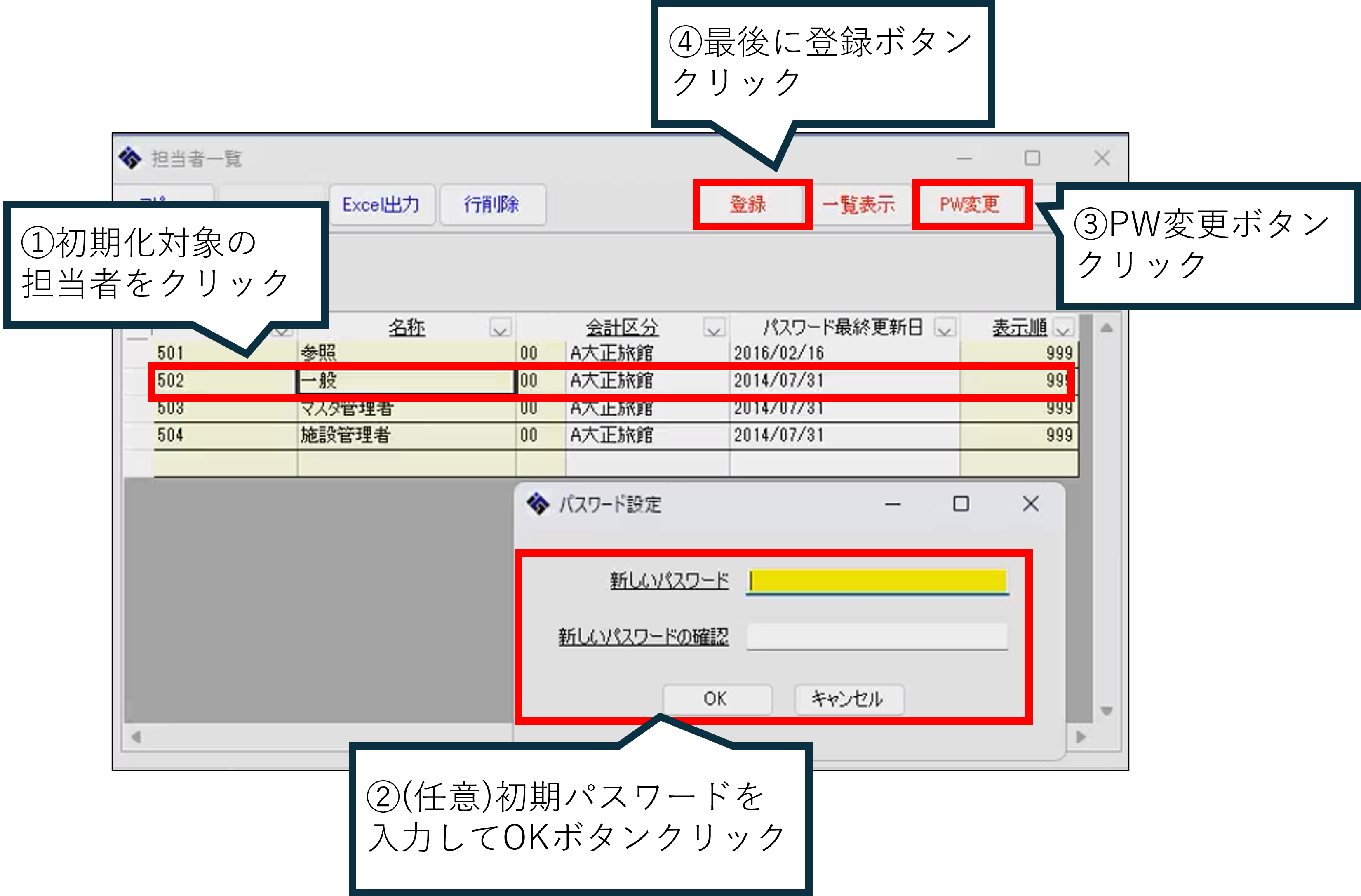 ※「登録」ボタンクリックまで完了しないとパスワード初期化は完了しません。ご注意ください。