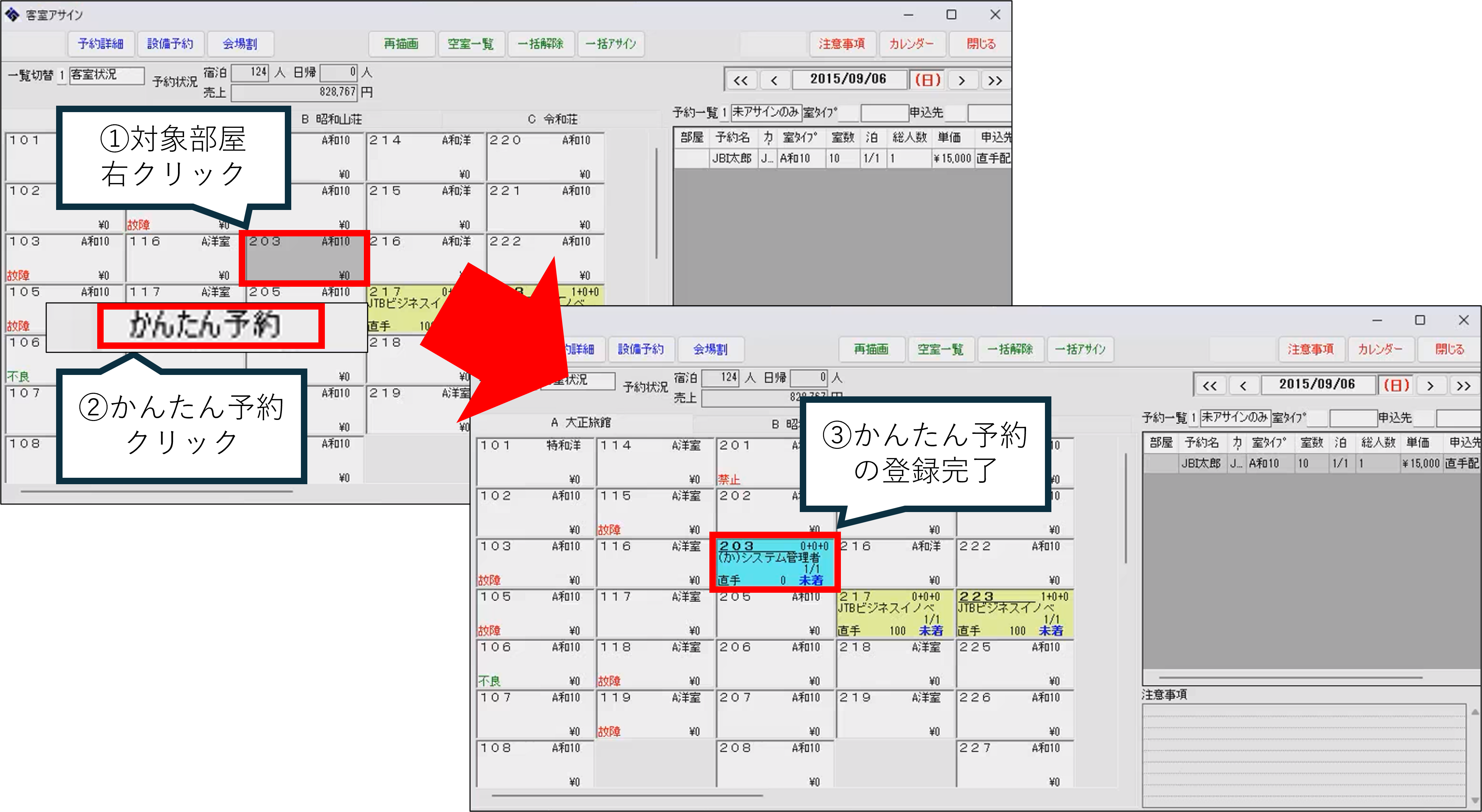 「客室アサイン」画面で空室の部屋を右クリックして表示される「かんたん予約」をクリックします。