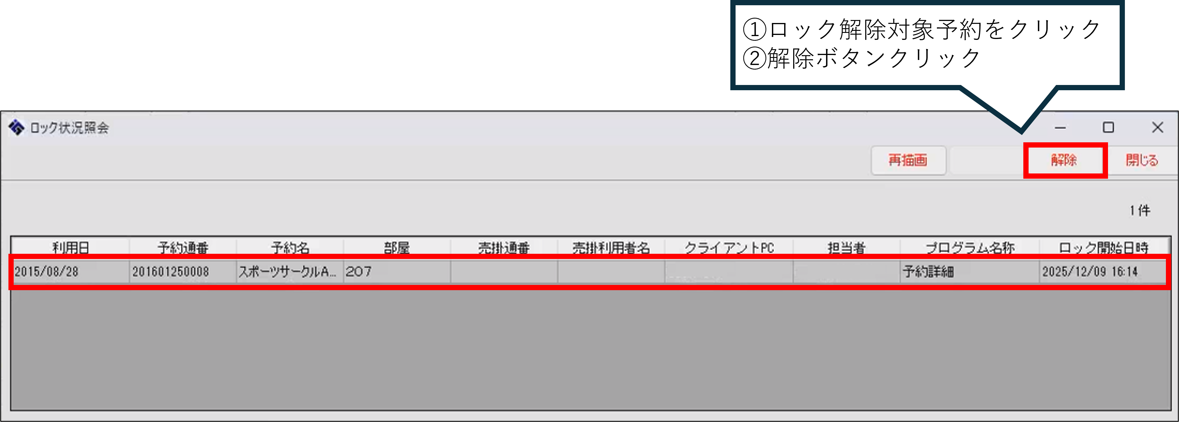 「システム」メニューの「ロック状況照会」画面を開きます。