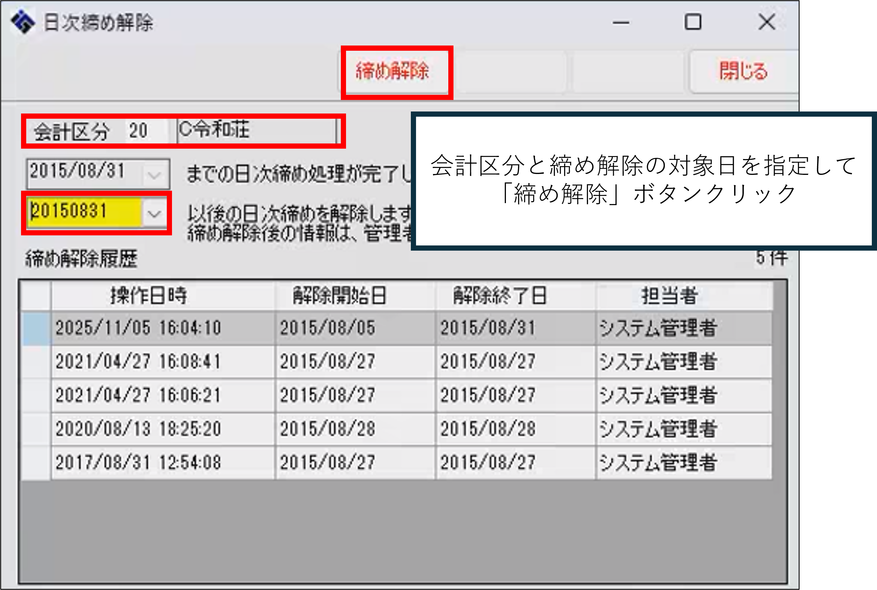 締め解除したい会計区分と日付を選択し「締め解除」ボタンをクリックします。