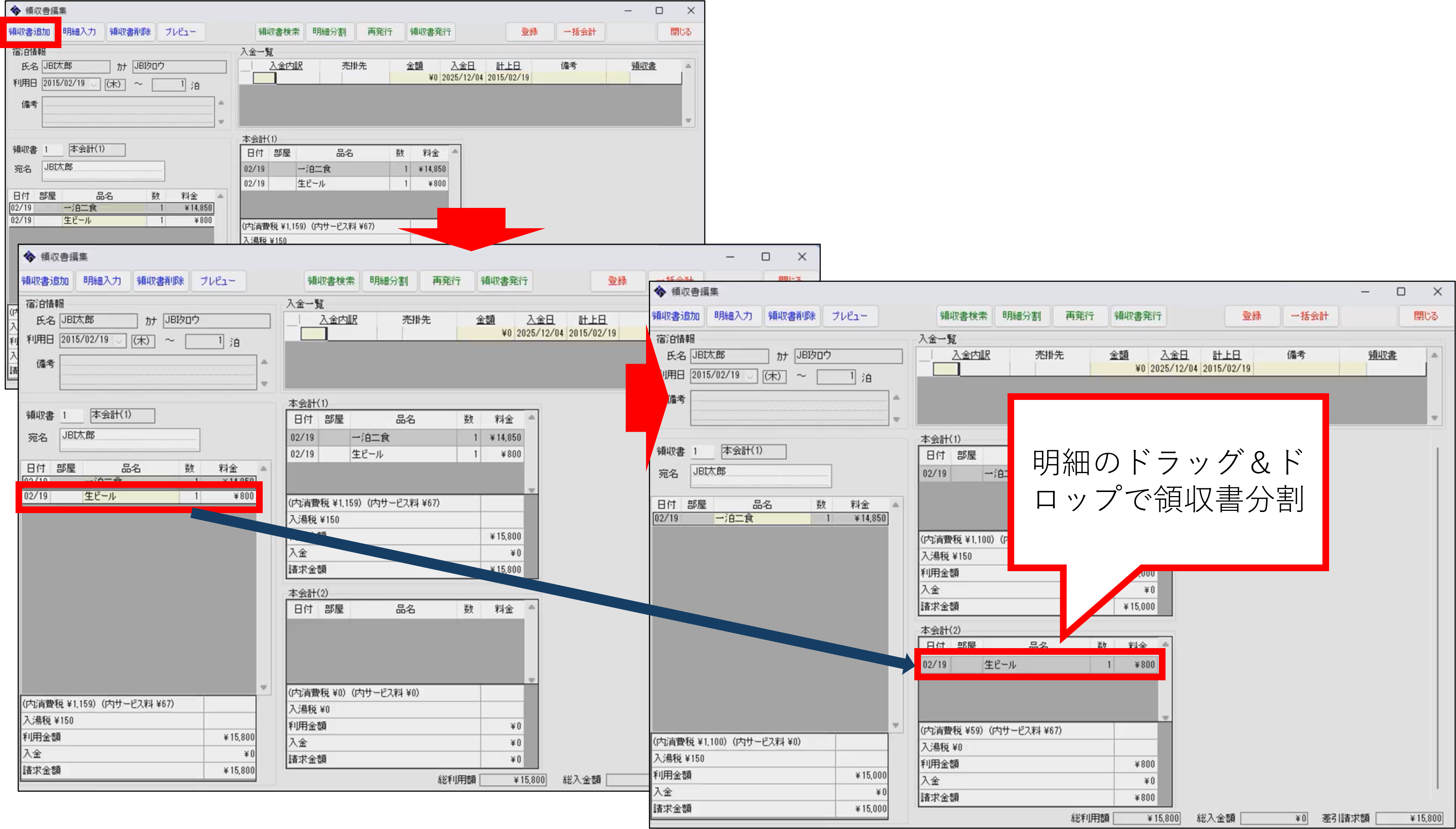 ※複数部屋予約で小部屋に領収書分割時は「領収書追加」不要です。