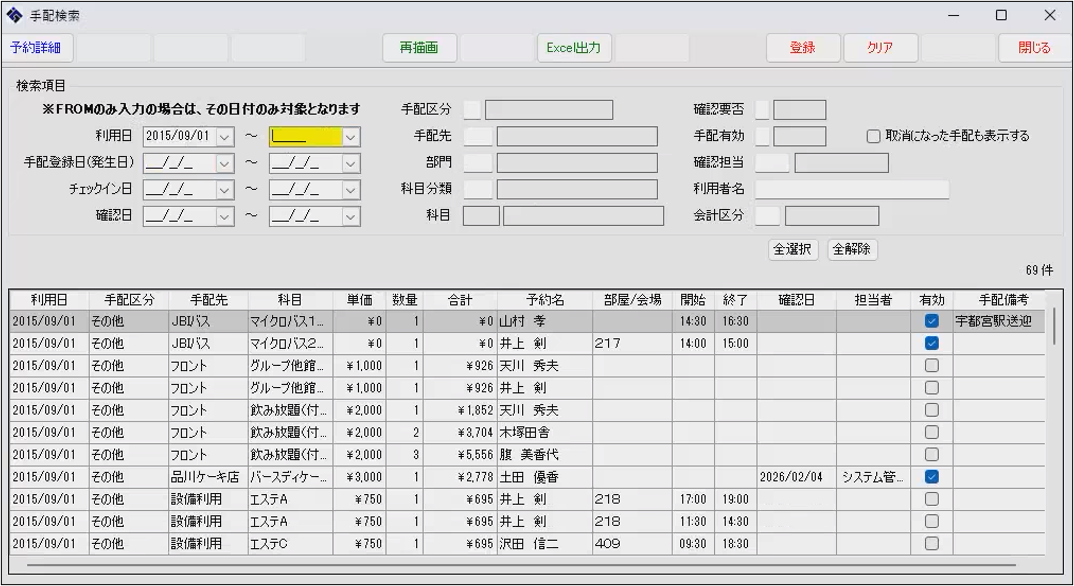 利用日、手配区分、手配先、科目、確認要否などの条件を指定して検索します。