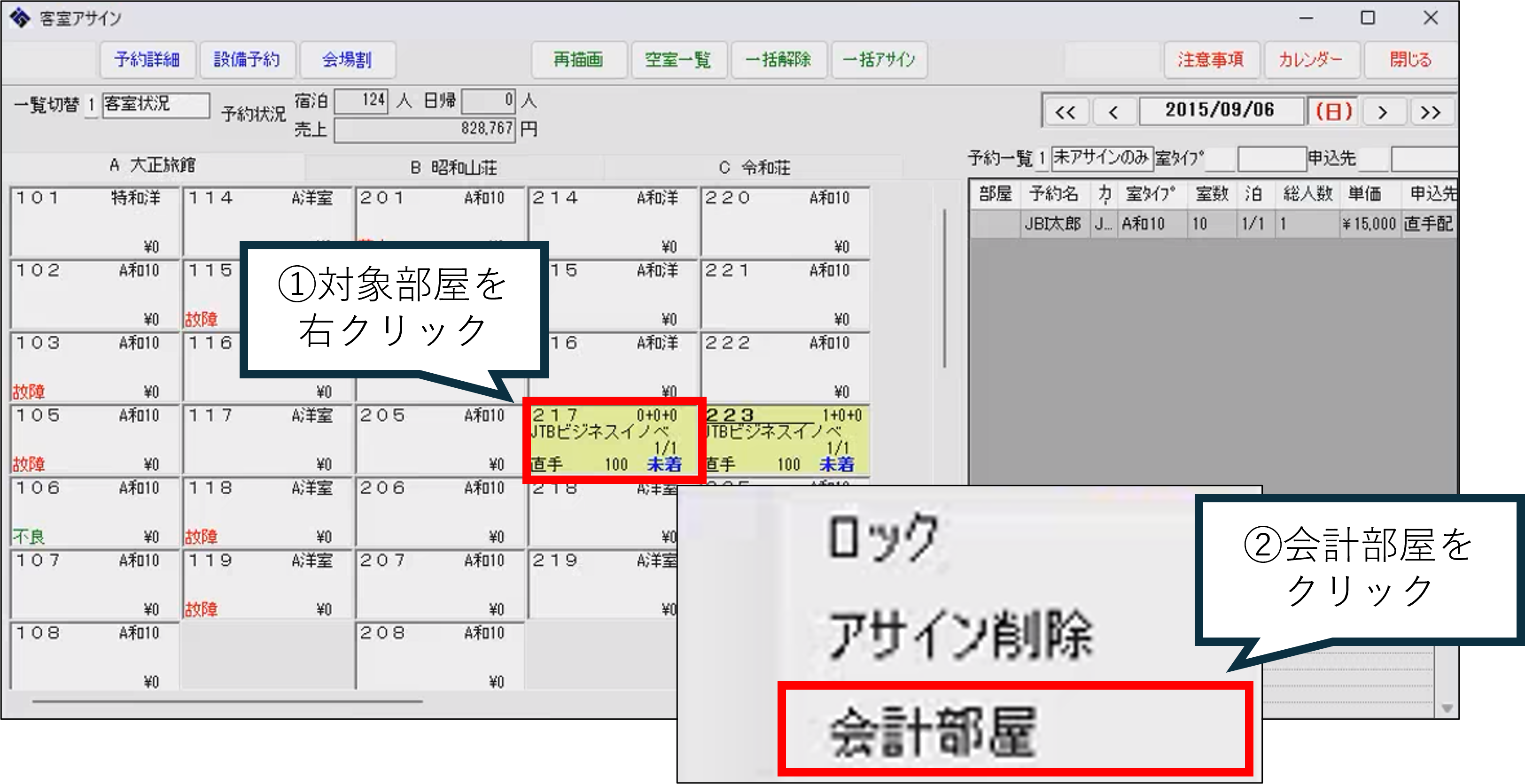 「客室アサイン」画面で、新しい会計部屋にしたい部屋を右クリックします。