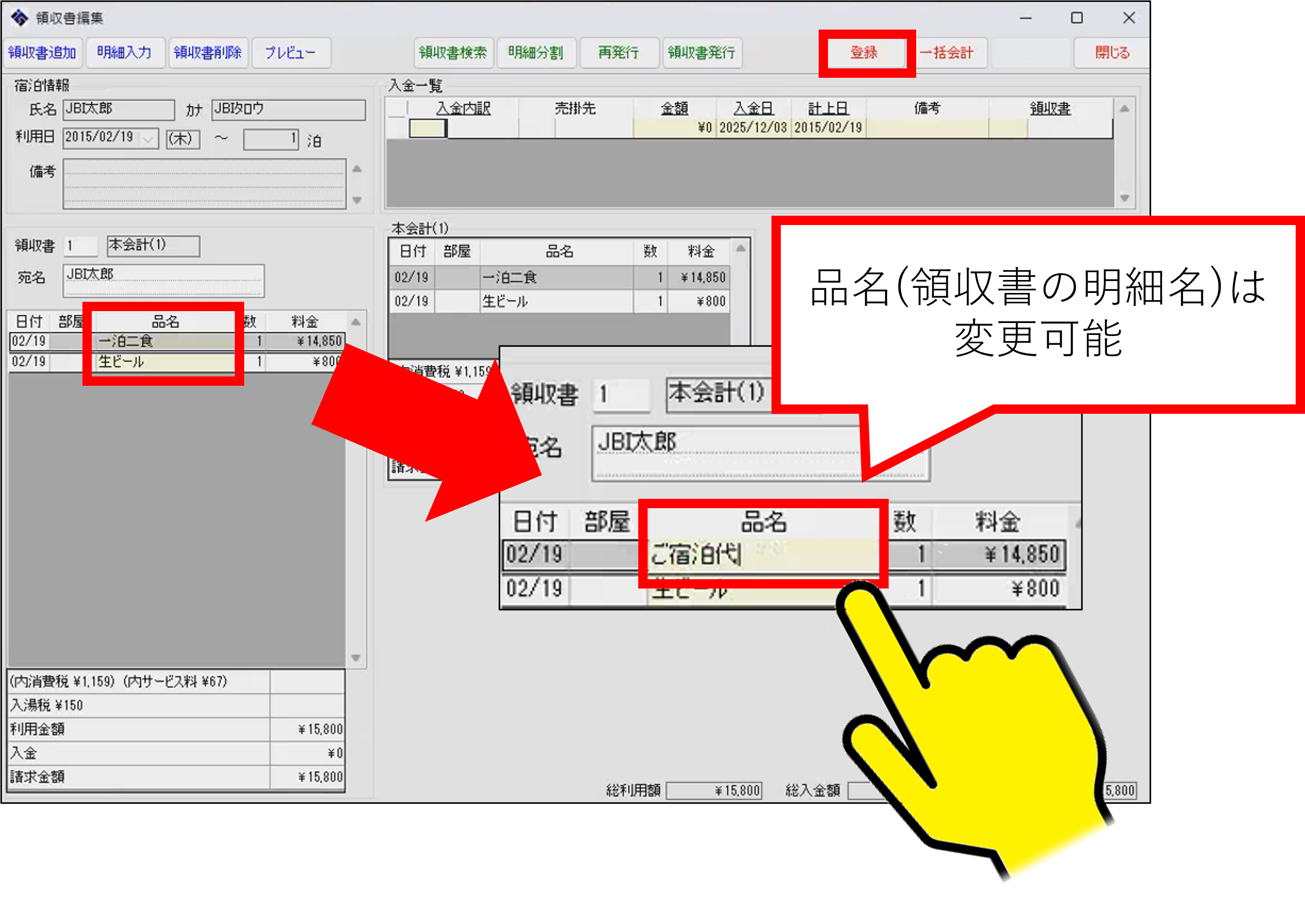 「領収書編集」画面を開きます。変更したい明細行の品名欄をダブルクリックして編集モードにします。
