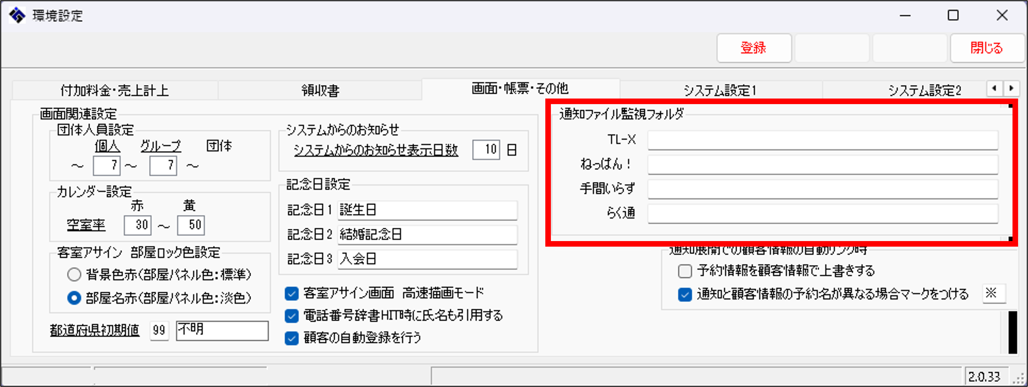 1.INCHARGE7メニュー>システム>環境設定>「画面・帳票・その他」タブをクリックします。