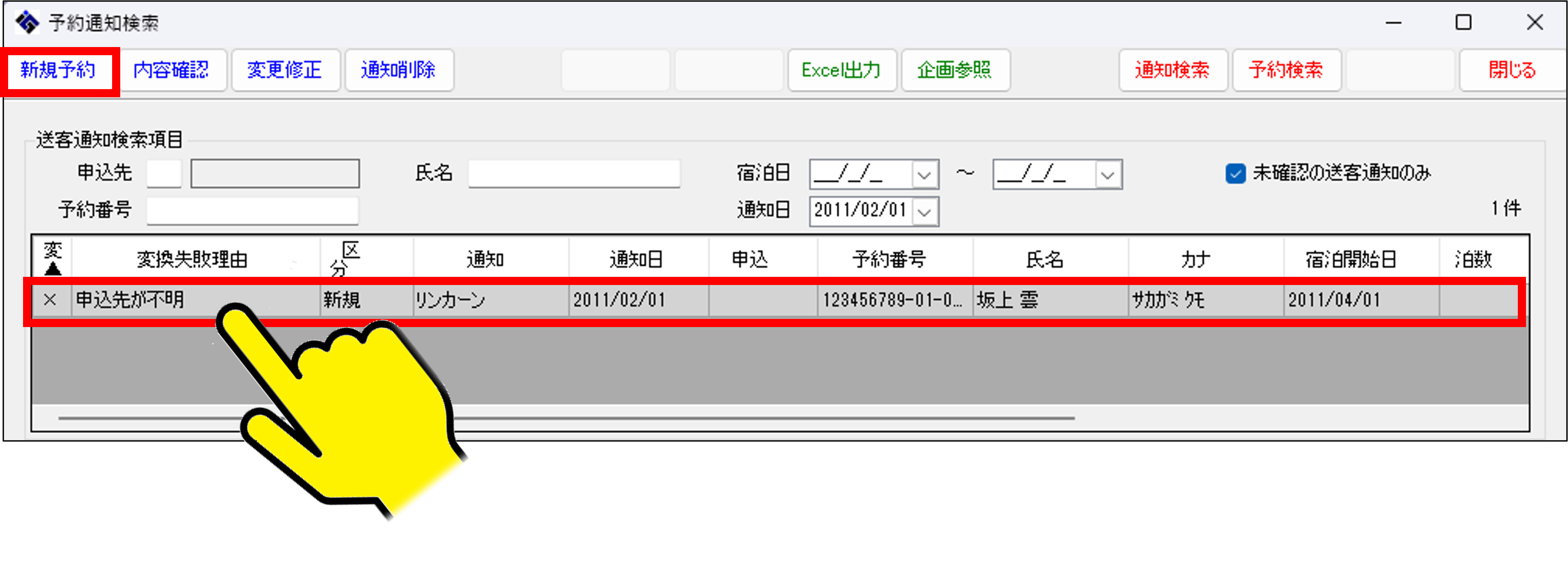 1.対象の「予約通知」行をクリックします。 ※クリック後はグレーアウト表示