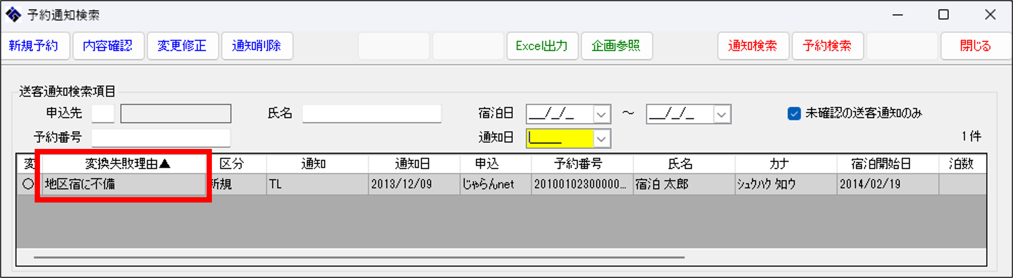 「地区宿に不備」と表示された