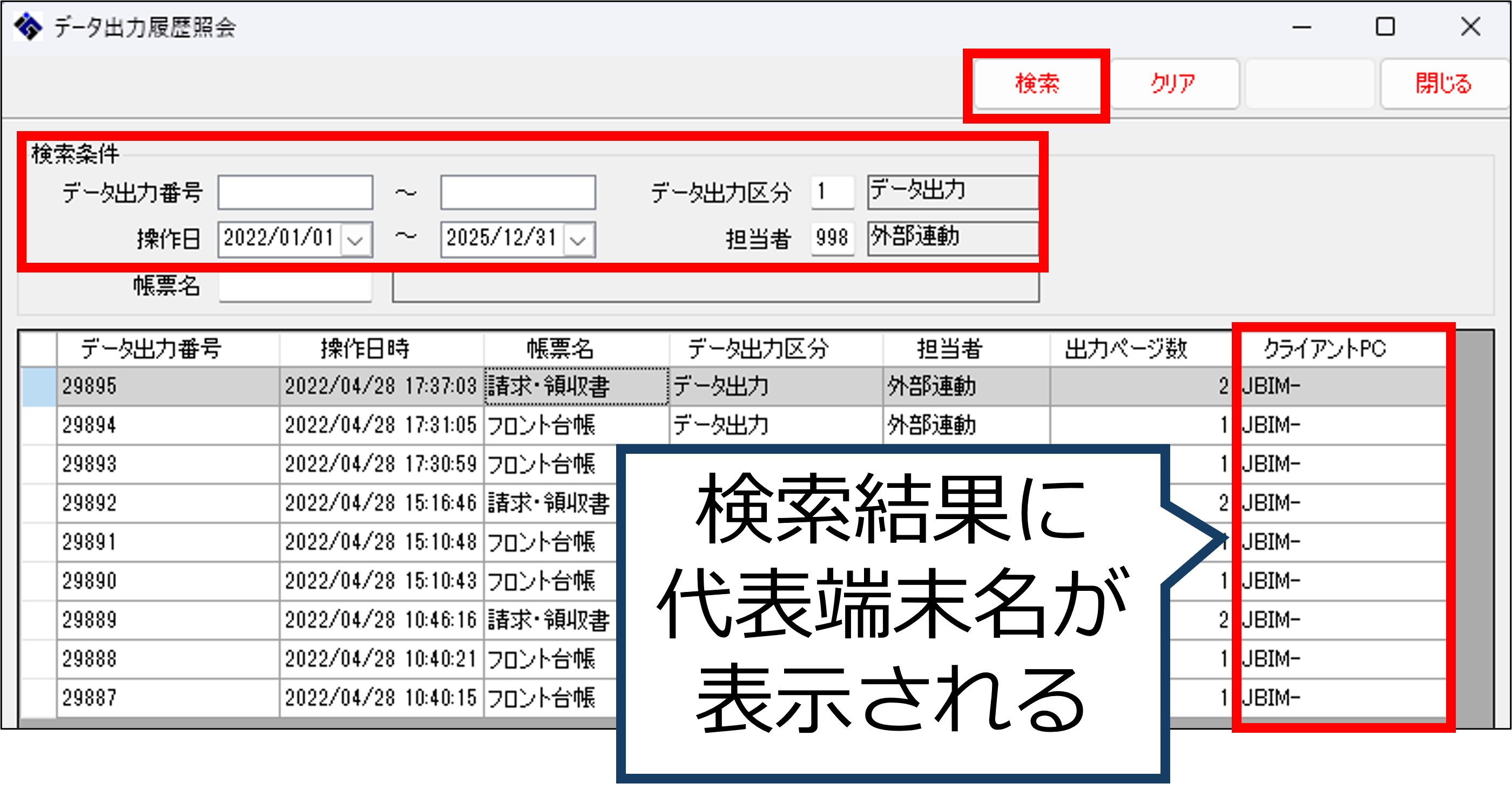 3.検索結果の「クライアントPC」名が「代表端末」です。