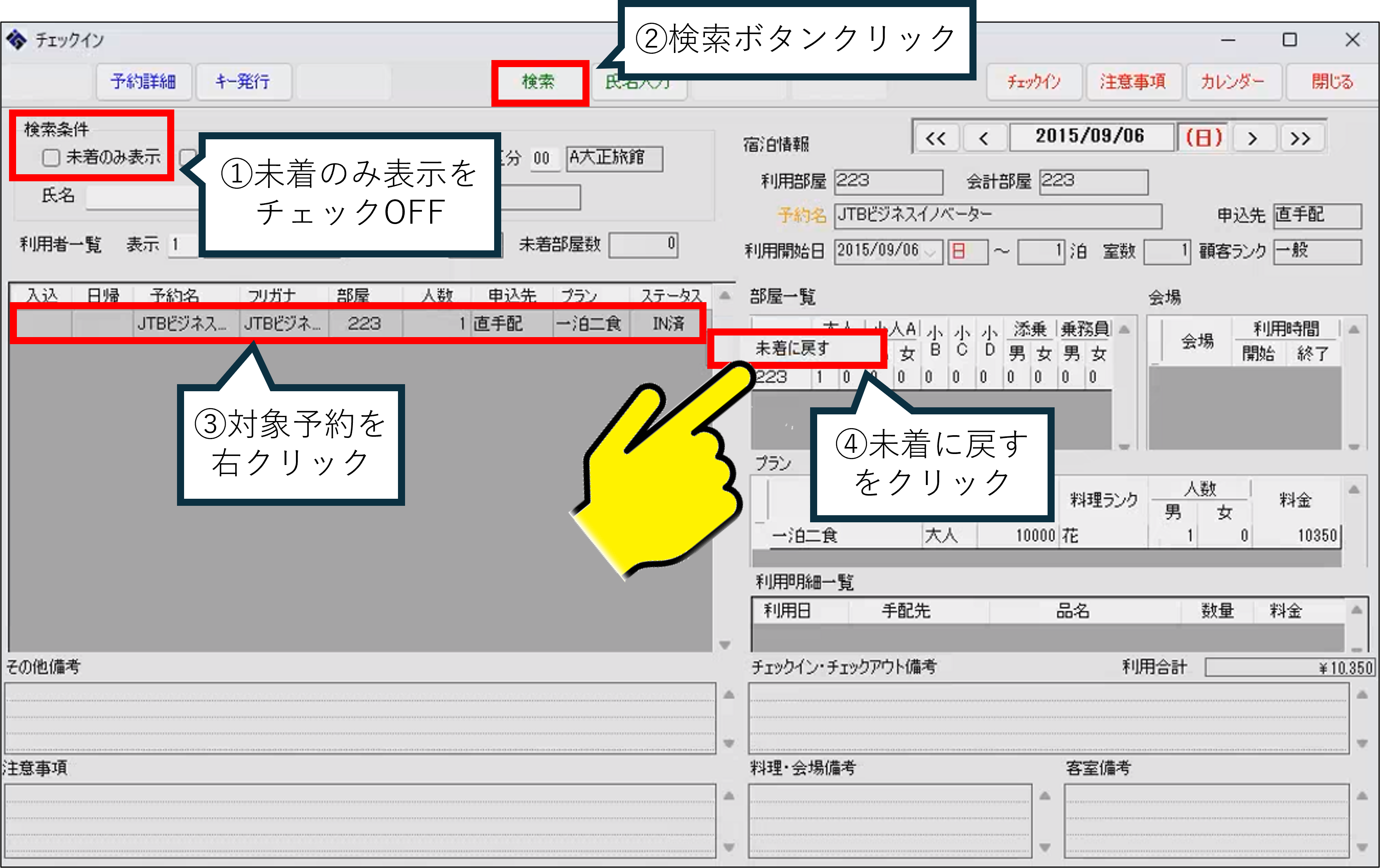 「チェックイン」画面で「未着のみ表示」のチェックを外し検索します。