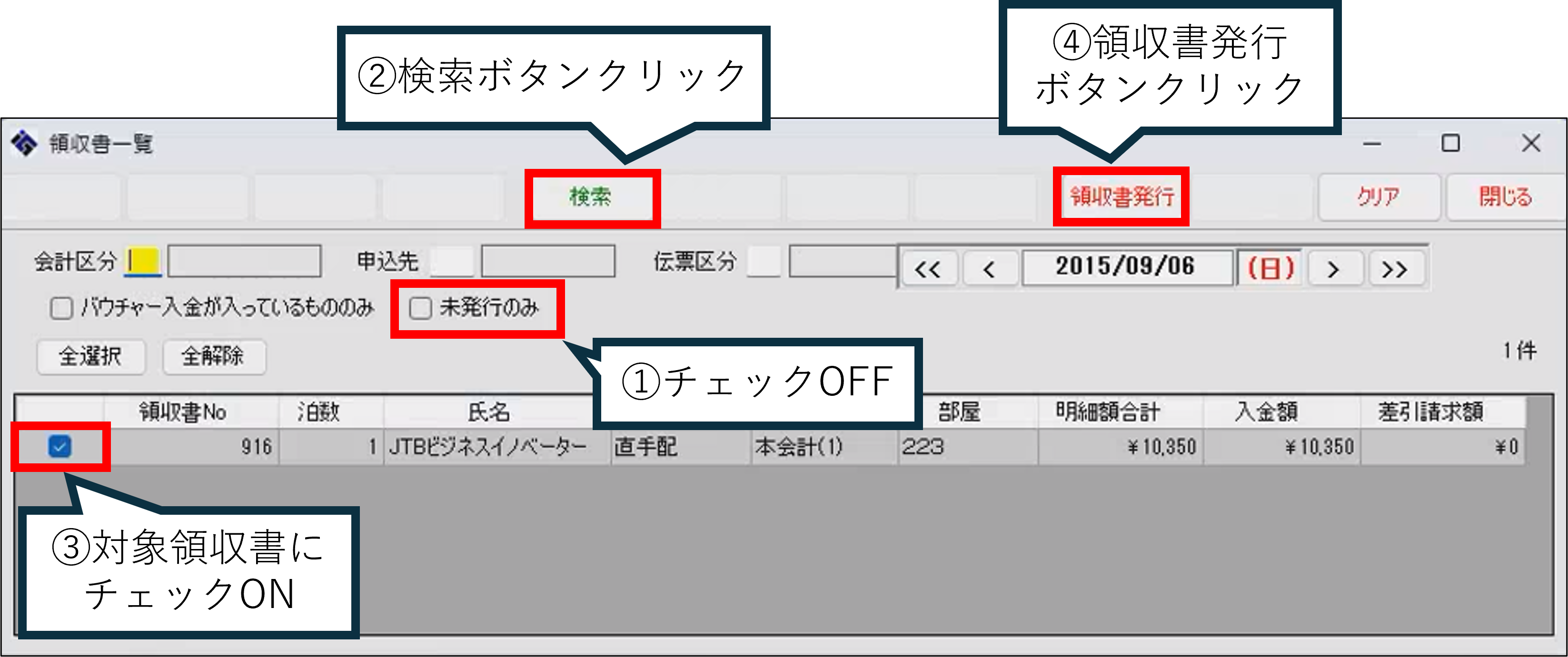 「領収書一覧」画面を開きます。「未発行のみ」チェックボックスをOFFにします。「検索」ボタンをクリックします。