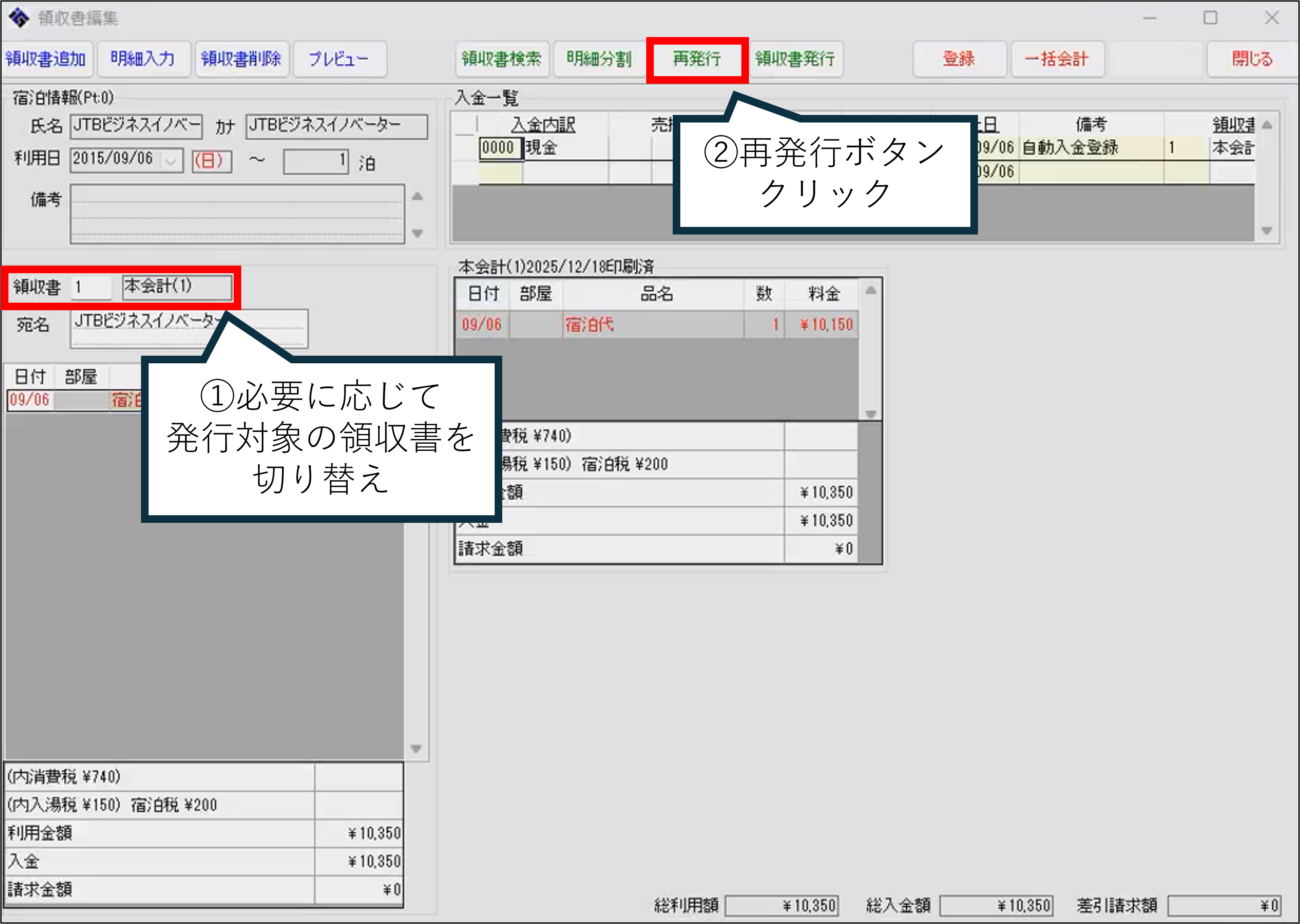 「領収書編集」画面を開きます。必要に応じて領収書欄で再発行対象の領収書を切り替えます。