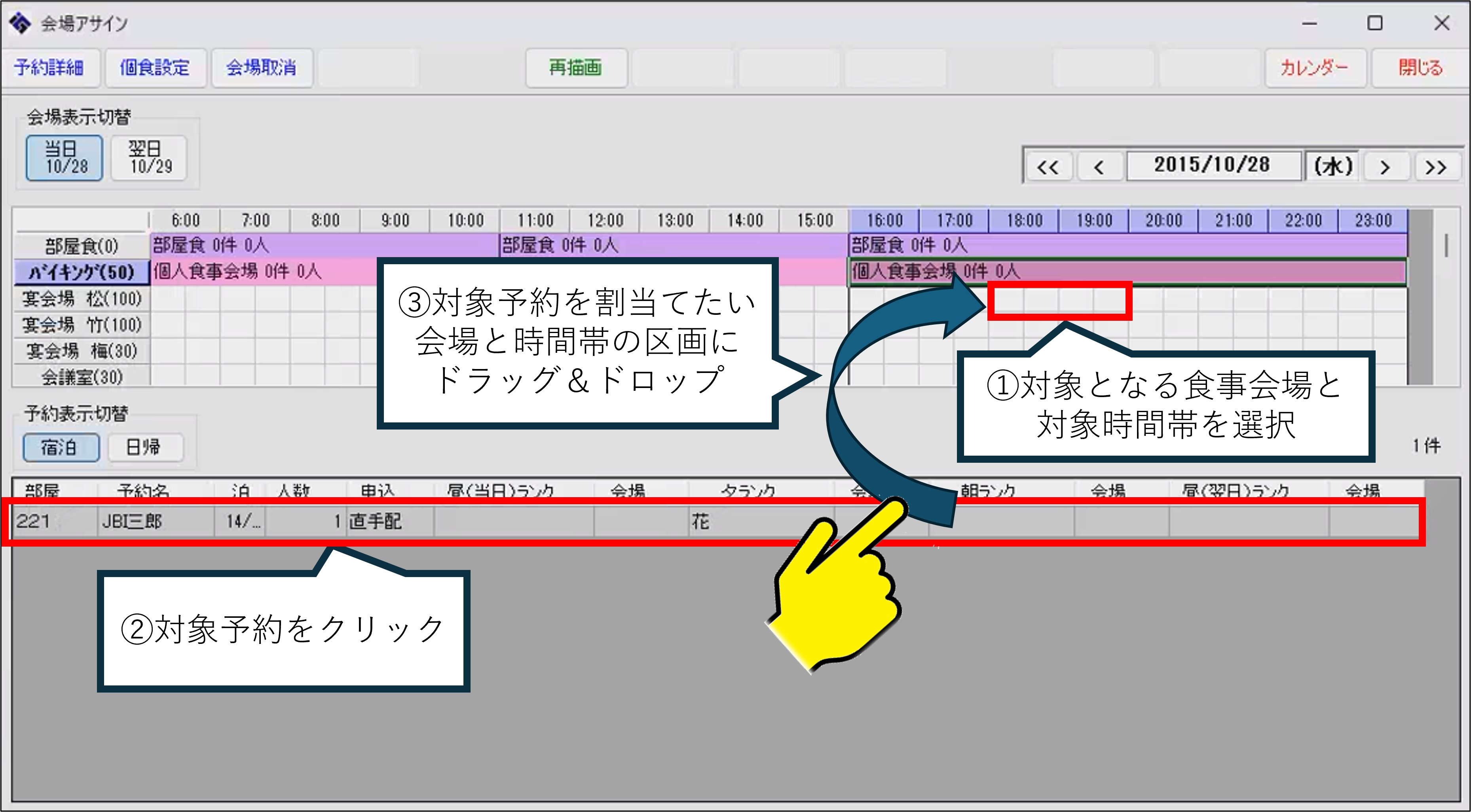 最後に、対象予約を割り当てたい会場と時間帯の区画にドラッグ&ドロップします。