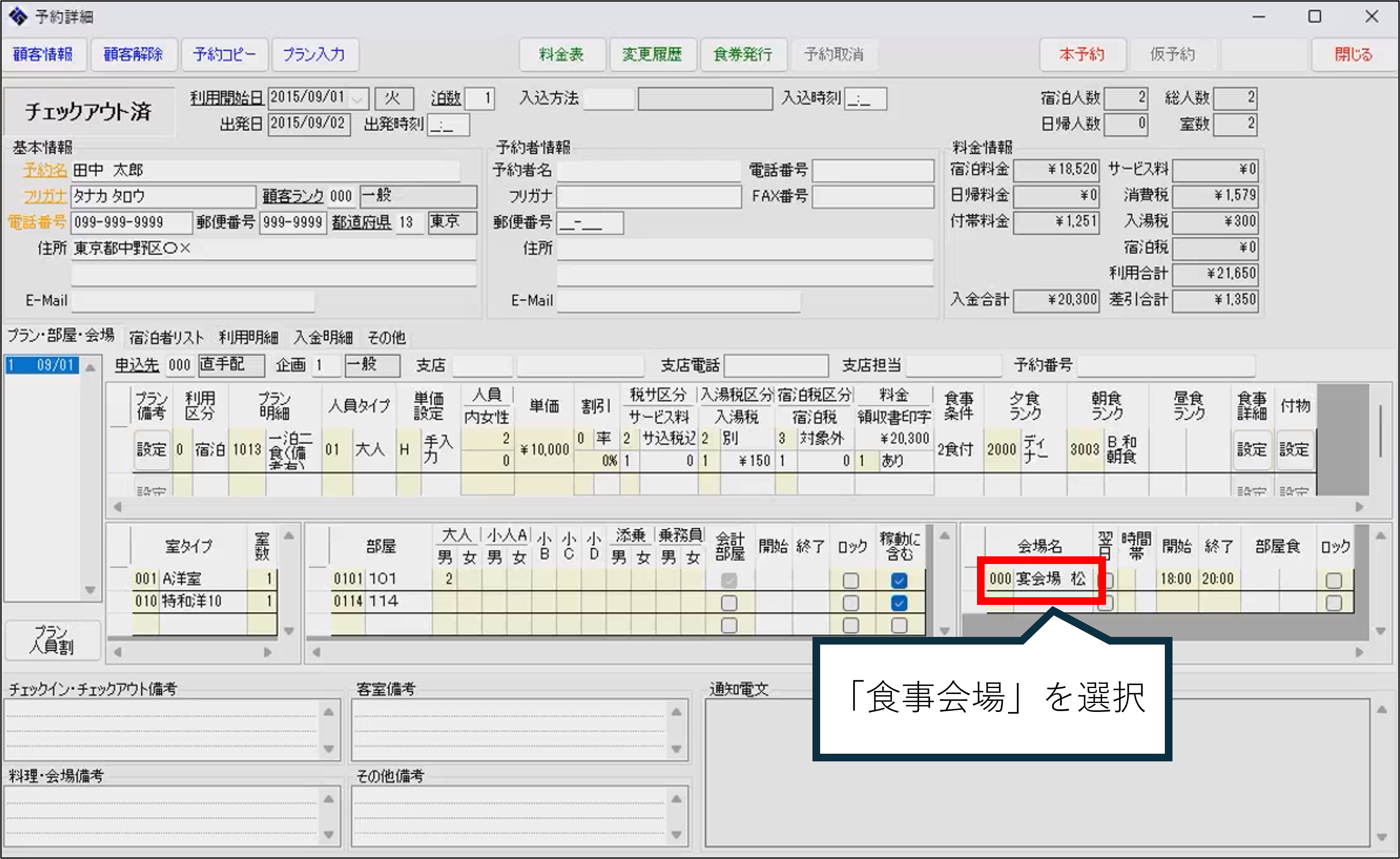 「予約詳細」画面の「プラン・部屋・会場」タブをクリックします。