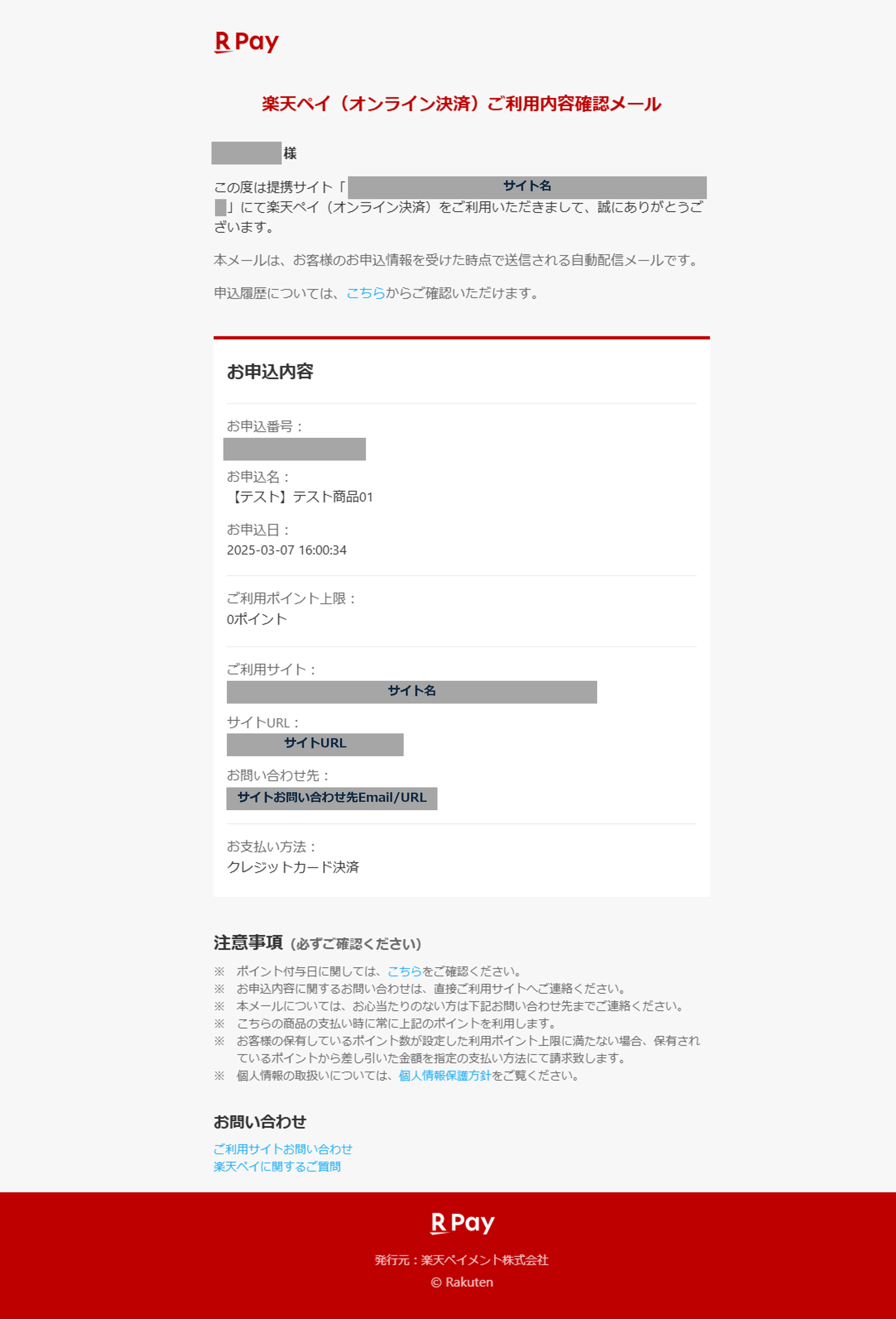| 1 | 楽天ペイ お申込完了(自動配信メール) | 汎用決済の申込が完了したことを知らせるメール |