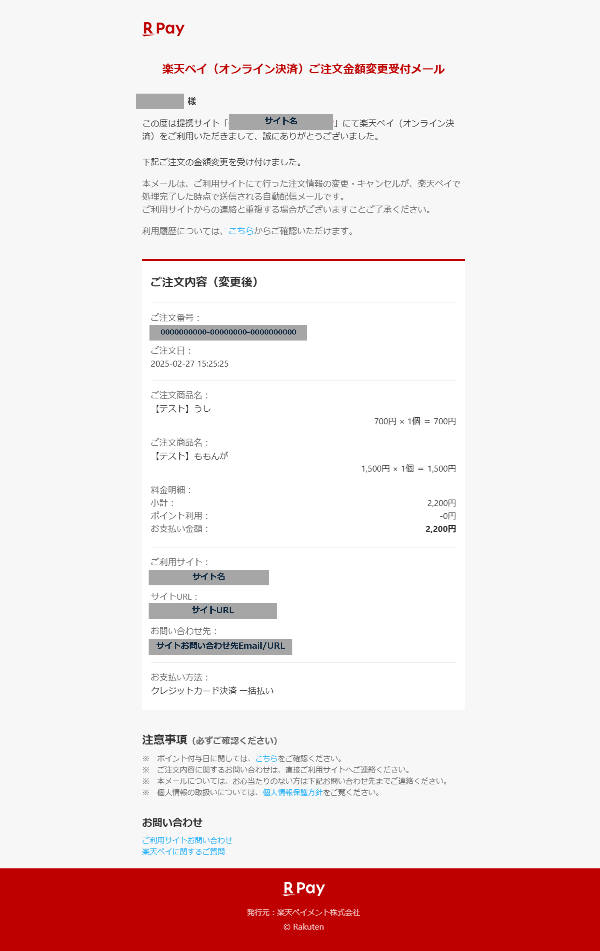 | 4 | 楽天ペイ 金額変更受付(自動配信メール) | 注文の金額変更処理が完了したことを知らせるメール |