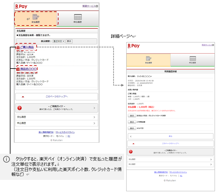 エンドユーザ様の楽天ペイ(オンライン決済)利用履歴では以下のように表示されます。