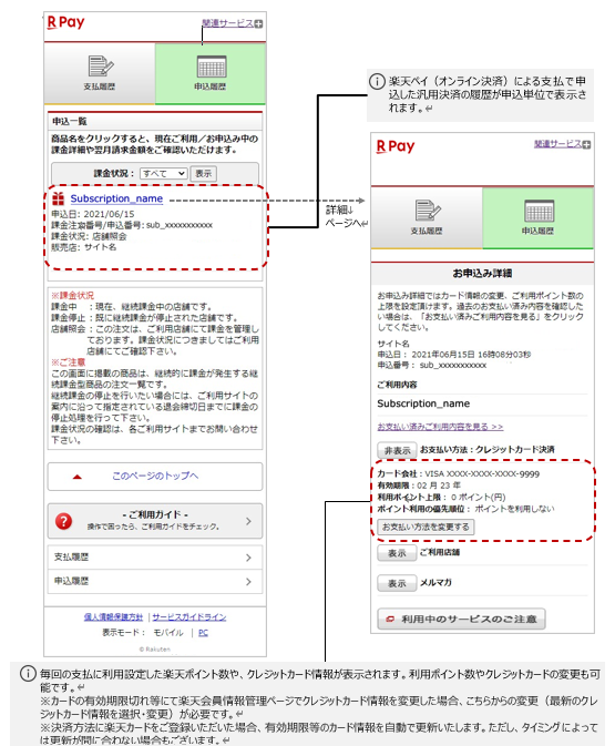 申込履歴については、楽天ペイ(オンライン決済)で申込した汎用決済の履歴が申込単位で表示されます。